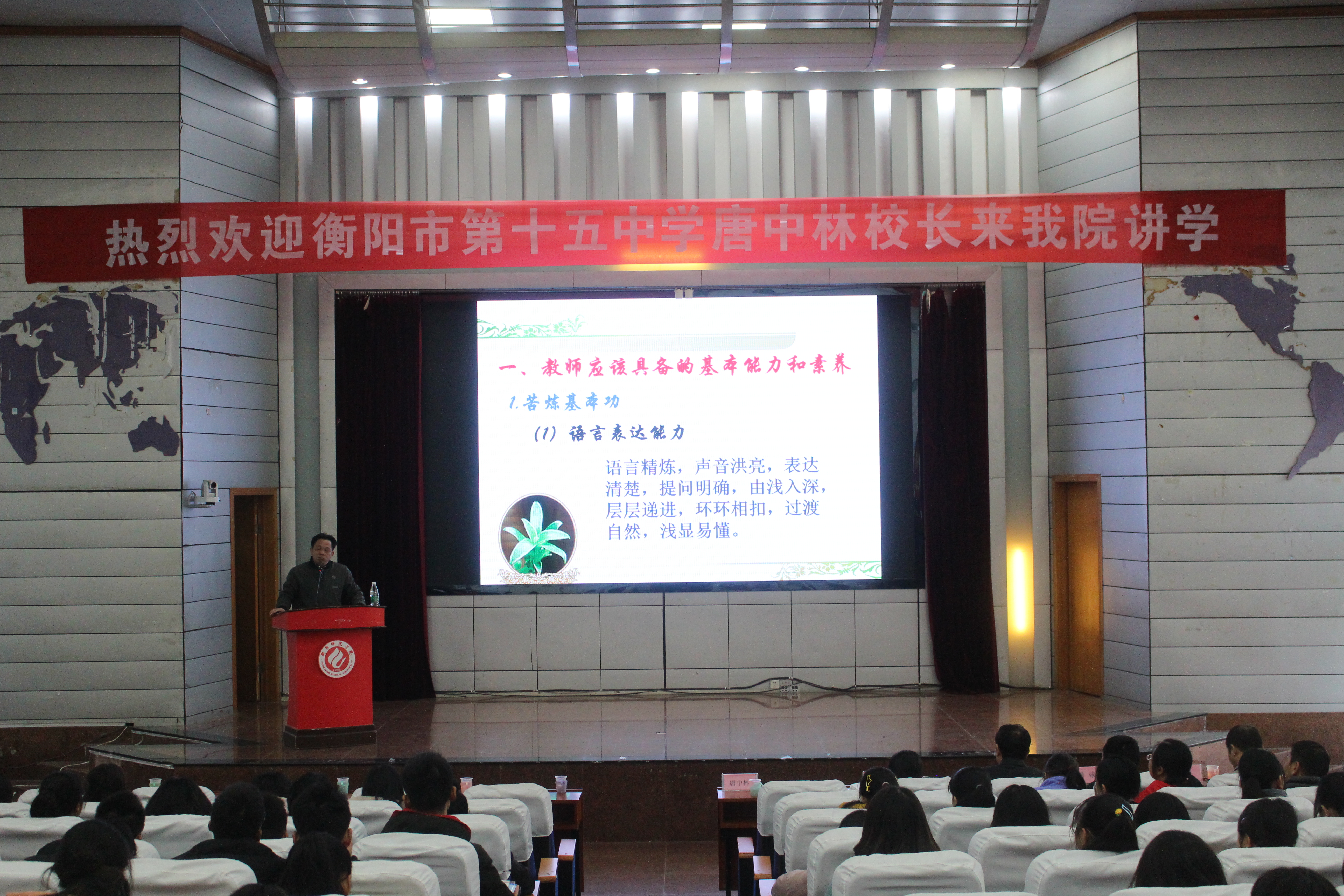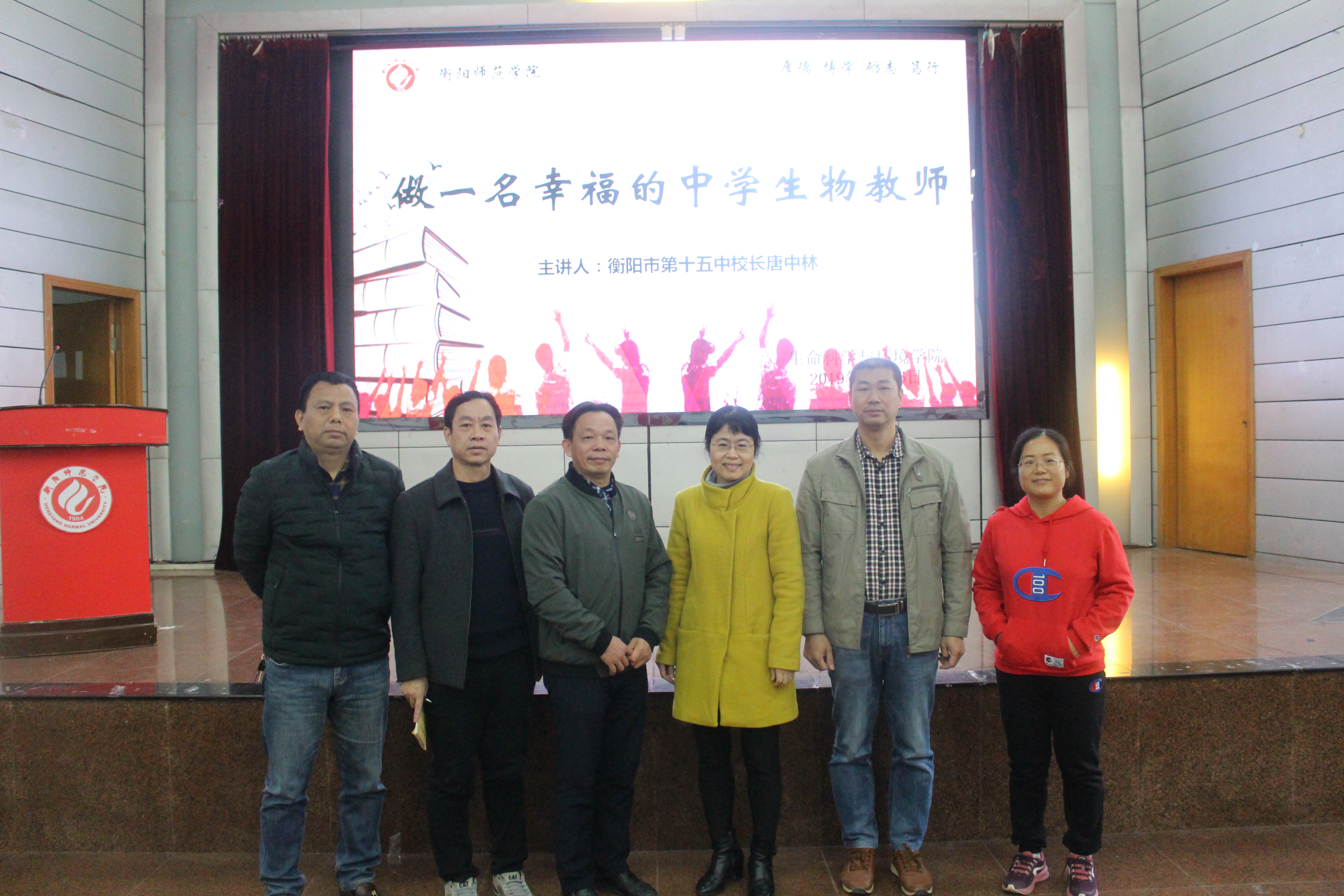 为营造良好的校园学术氛围,加强学科建设,促进学术交流,同时提高德赢官网师范生教学技能,加强师范生对教师行业的了解,12月6日上午10:30,德赢官网特邀请衡阳市第十五中学校长唐中林在西校区学术报告厅做了题为《做一名幸福的中学生物教师》的学术报告。报告会由生命科学与环境学院院长曹丽敏主持,党总支书记彭晖,副院长易诚、杨海及师生代表约200余人聆听了本次讲座。