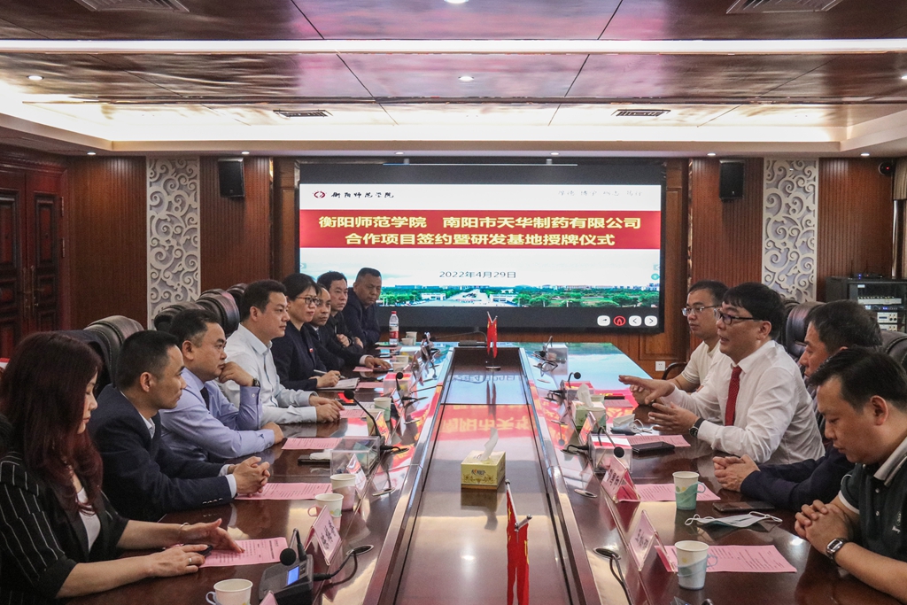 4月29日上午,德赢AC米兰中国官方网站与南阳市天华制药有限公司合作项目签约暨研发基地授牌仪式在办公楼二会议室举行。校长皮修平、南阳市天华制药有限公司董事长王峰、副总裁孙国印等一行四人出席会议,副校长魏晓林主持会议。