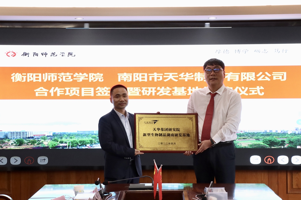 魏晓林和孙国印代表双方签署合作开发合同。项目研究团队负责人、生命科学与环境学院唐青海博士接过企业授予的“天华集团研究院新型生物制品湖南研发基地”牌匾,开启校企合作新篇章。