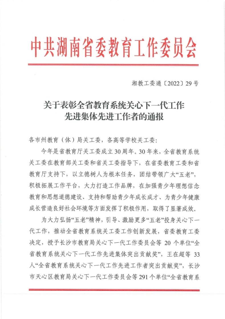 近日,省委教育工委印发了《关于表彰全省教育系统关心下一代工作先进集体先进工作者的通报》,德赢官网荣获“全省教育系统关心下一代工作先进集体”荣誉称号。