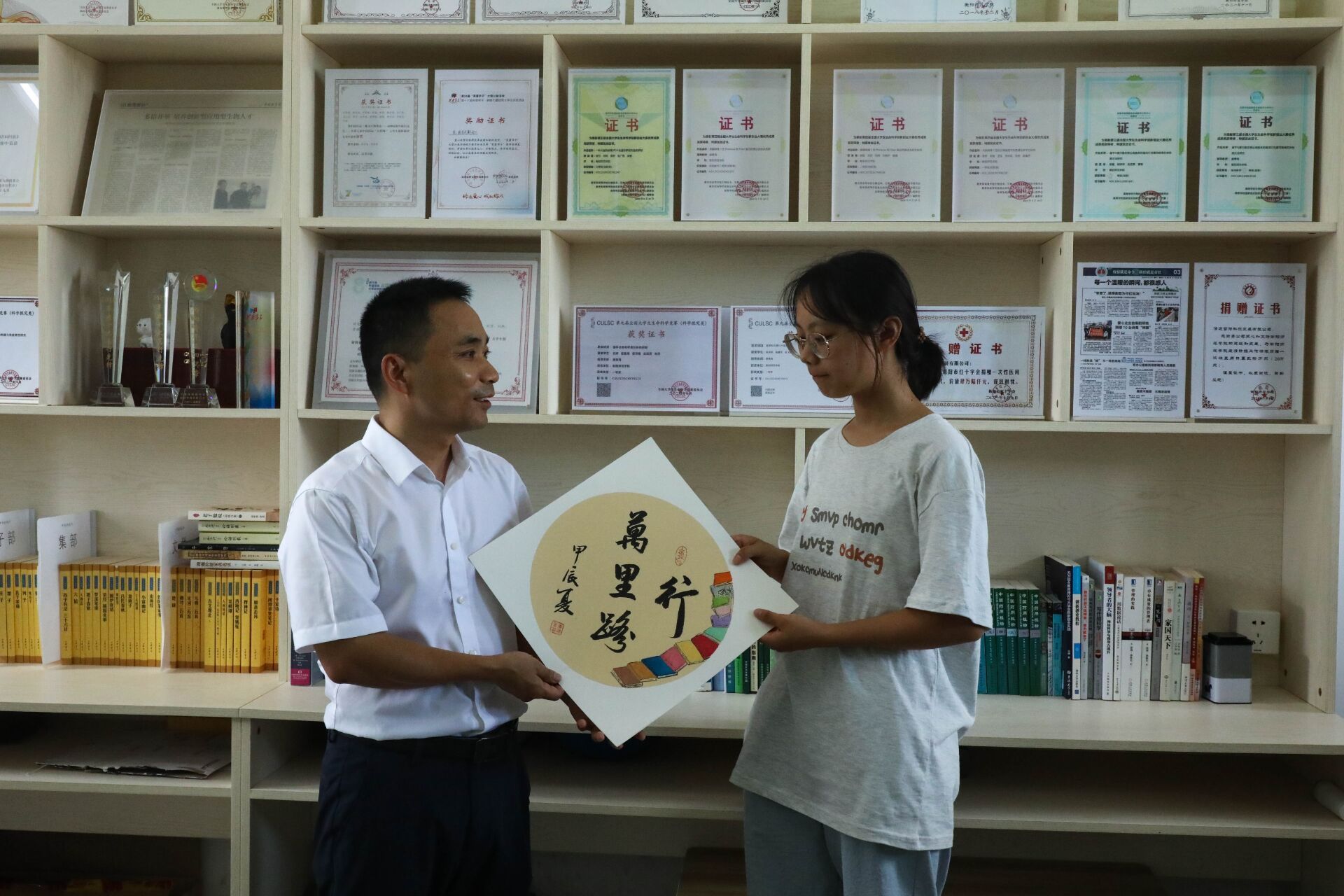 “行万里路”——这是唐教授对生物科学专业2405班新生黄婷玉的寄语,他说“我希望你在今后的人生当中,不仅要读万卷书,更要行万里路,做四有青年,在未来更要做四有好老师”,黄婷玉同学表示“很荣幸今天能收到唐教授的这幅字画以及鼓励,在今后的学习中,我定当不负唐博士的期望,行万里路”。