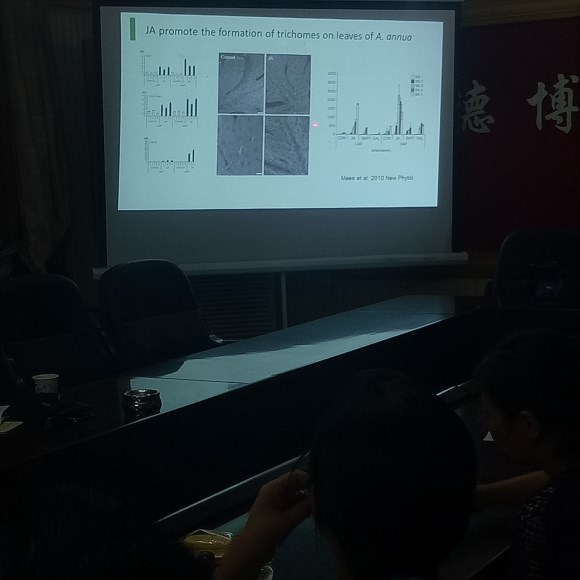 2017年9月28号晚19点,生命科学与环境学院第七届教师学术沙龙交流会于德赢官网西校区行政楼三楼会议室隆重召开。曹丽敏院长、易诚副院长、宾冬梅教授等14位老师出席。本次学术沙龙由江伟民博士主讲,江博士报告的主题为“植物特异性的转录因子调控青蒿素中青蒿素代谢途径的研究”。江博士首先简要介绍了研究的背景及意义,指出青蒿中青蒿素的含量太低,难以满足市场需求。接着,江博士介绍了提高青蒿素的产量的方法。通过比较发现微生物代谢工程方法可以合成青蒿素前体物质,但其生产的青蒿素成本相对较高,而利用植物代谢工程方法生产青蒿素则更加经济适用。最后,江博士详细阐述了利用植物代谢工程方法来提高青蒿素的含量的几种做法。