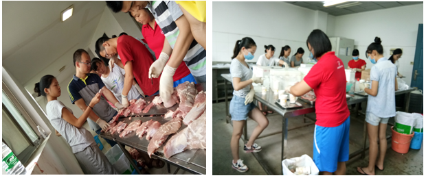 实采样是一门技术活,首先,得根据所学的知识分清楚肠道的每一段是什么,比如连接胃的是十二指肠,然后是空肠、回肠、盲肠、结肠。然后就是刮粘膜,必须使用生理盐水洗肠道,你们知道为什么吗?因为要维持渗透压平衡!当然不止是采肠道需要技术,其中分离肌肉也是一门真正的学问,这次我们很荣幸的一睹华中农业大学的博士专门过来分离小腿肌肉,他们的手法真的很娴熟,真的是台上一分钟,台下十年功啊!
