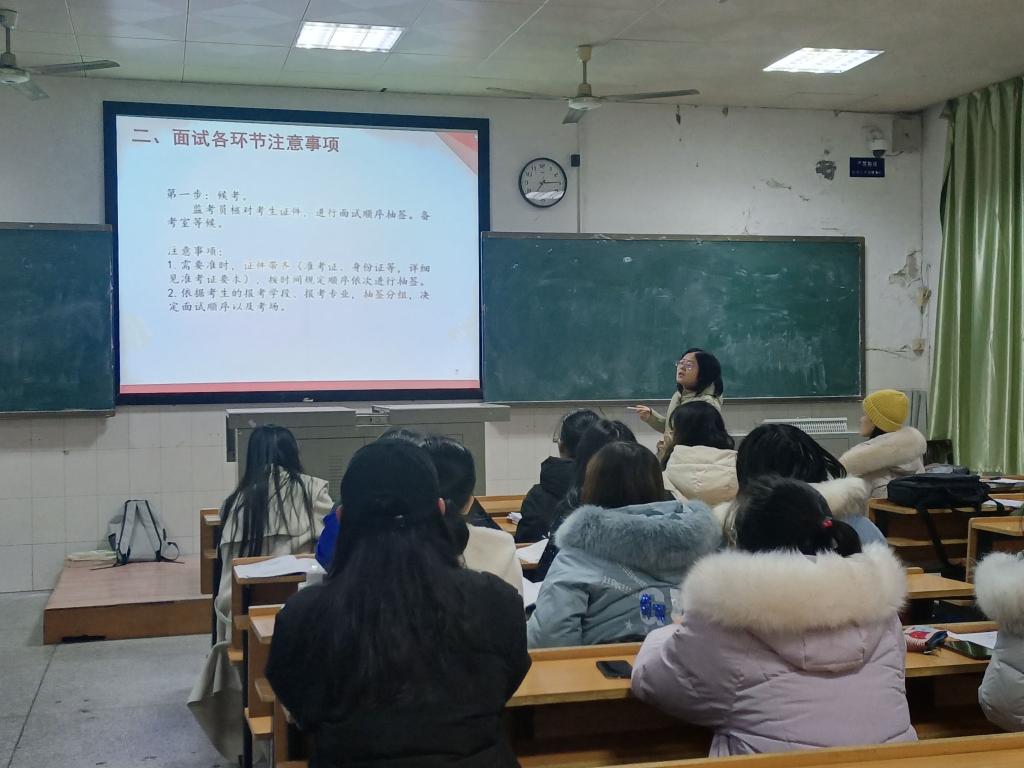 12月22日晚,德赢官网在外语楼101召开了教师资格考试面试指导会议,江伟民、王娜、刘宇华等老师,以及2018级通过教师资格笔试的同学参加了本次会议。