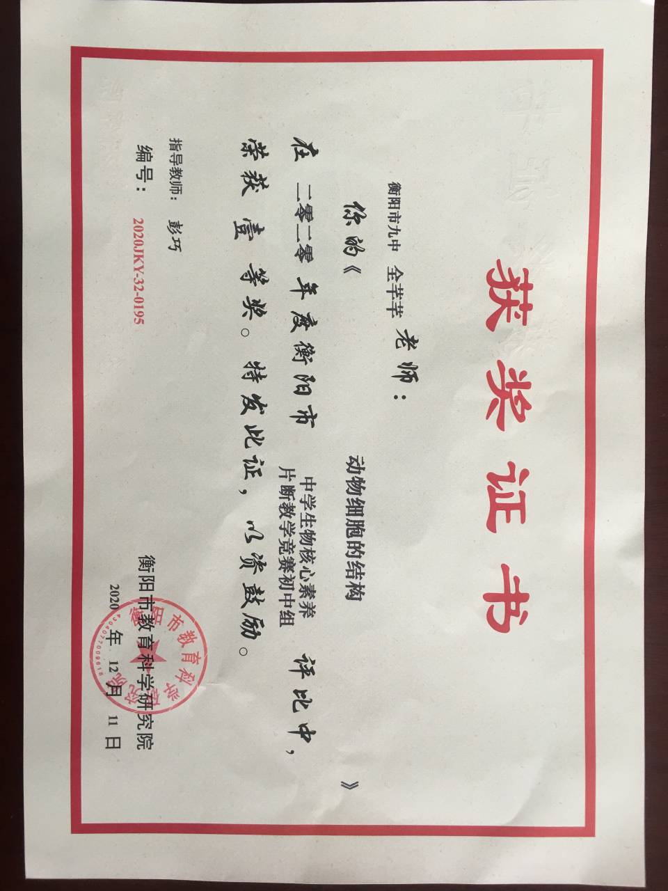 二.获奖情况:由衡阳市教育科学研究院主办的“2020年衡阳市中学生物核心素养片段教学比赛”中获得一等奖。