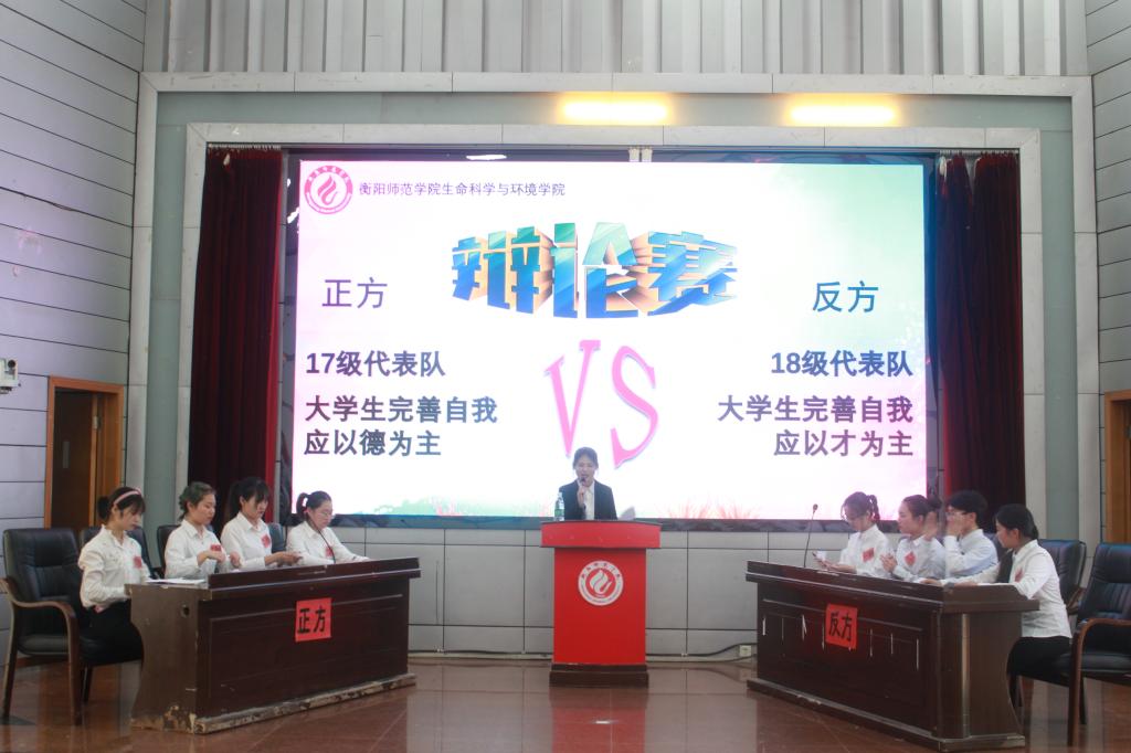 比赛两支队伍分别是来自17和18级的年级代表队,双方就“大学生完善自我应以德为主还是应以才为主”展开激烈辩论。 1703班辩论队持正方观点,开篇立论“大学生完善自我应以德为主”,引经据典,提出大学生完善自我是指大学生达到自身标准,同时满足国家社会对其的要求。1804班辩论队持反方观点,智辩驳回,立论明确,提出‘“德”的追求是无止境的,而社会发展到今天,这巨大变化主要靠的是人们的智慧与才干,仅靠高尚的德行、平庸的才学实在是远远不够’。现场气氛迅速升温。