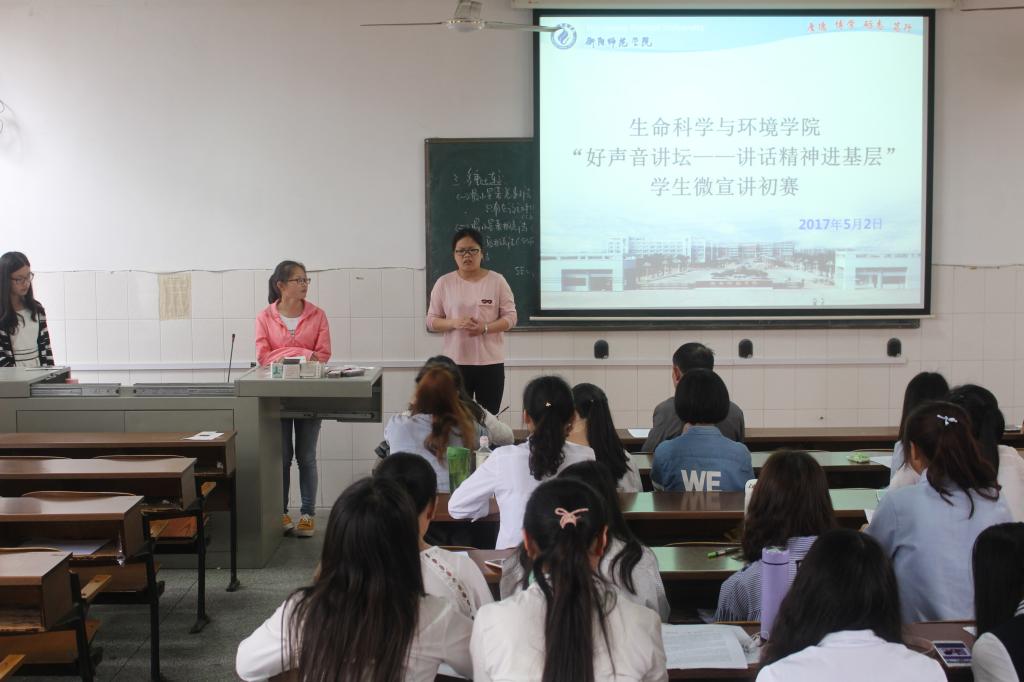 5月11日晚19时,“好声音讲堂-讲话精神进基层”师生微宣讲比赛学生组决赛在东校区音乐厅举行。生命科学与环境学院3支代表队结合自身学习和生活实际,用富有感染力的表达、鲜活真实的事例和充满激情的语言,从不同角度诠释对“习近平总书记系列重要讲话精神”的深刻理解,赢得了观众的热烈掌声。经过激烈地角逐,德赢官网15级生物科学1班荣获三等奖,15级生物科学2班、15级环境工程1班荣获优胜奖。