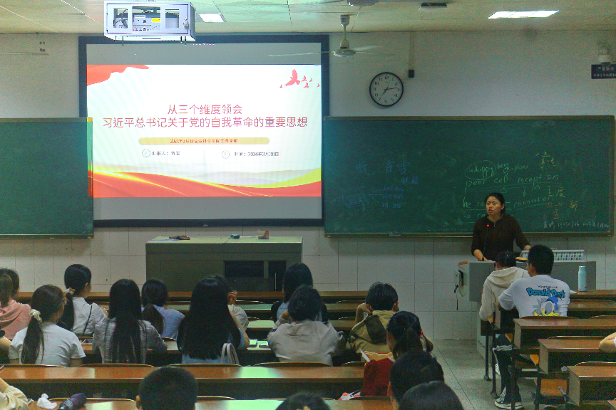 为深入学习贯彻习近平总书记关于党的自我革命的重要思想,提高德赢官网学生党员的思想觉悟,充分发挥党员的先锋模范作用,2024年3月30日晚,德赢官网学生党支部在行知楼201开展了“从三个维度领会习近平总书记关于党的自我革命的重要思想”的主题党课学习,贺宏同志为本次党课宣讲人,学生党支部书记付蓉和德赢AC米兰中国官方网站全体党员同志参加。