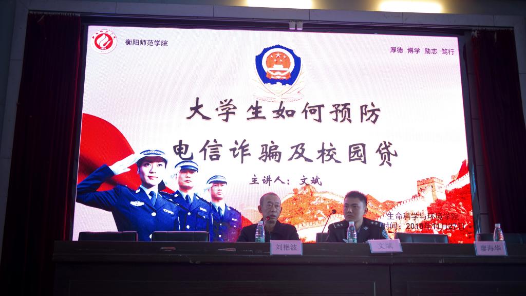 11月27日下午3时许,生命科学与环境学院、保卫处联合衡阳市公安局雁峰区分局在西校区模拟法庭举办以“大学生如何预防电信诈骗及校园贷”为主题的网络安全知识宣讲会。衡阳市公安局雁峰区分局网安大队网警文斌为主讲人。生命科学与环境学院党总支书记刘艳波,副书记廖海华,团委书记刘树芬,辅导员许若霏老师参会,17级、18级学生到场聆听学习。