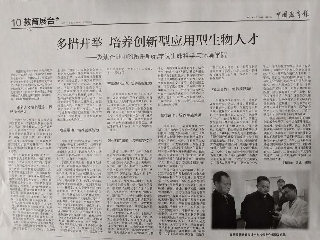 德赢官网培养创新型应用型生物人才喜被中国教育报报道