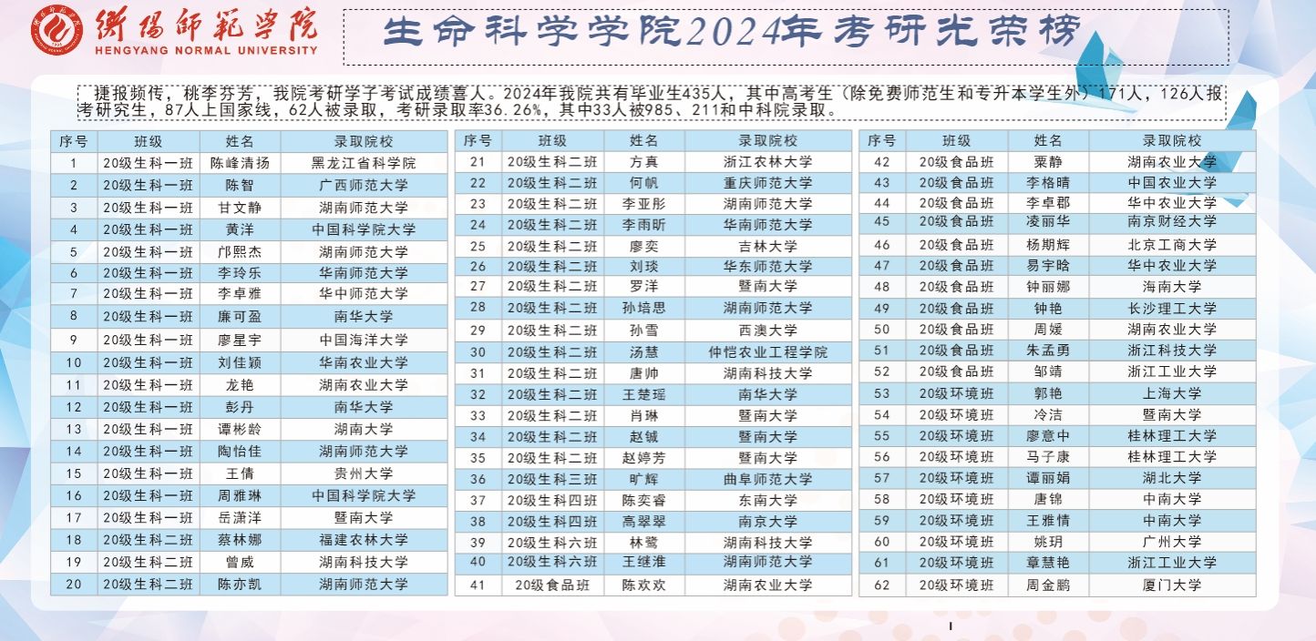 捷报频传,桃李芬芳,德赢官网考研学子考试成绩喜人。2024年德赢官网共有毕业生435人,其中高考生(除公费定向师范生和专升本学生外)171人,126入报考研究生,87人上国家线,62人被录取,考研录取率36.26%,其中33人被985、211和中科院录取。